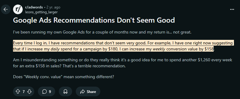But it’s important to know: often these are third-party contractors with one job: get you to spend more. Their advice often just lines up with the same AI recommendations in your dashboard. They might push Performance Max, broader audiences, or higher budgets—anything that bumps your ad spend.